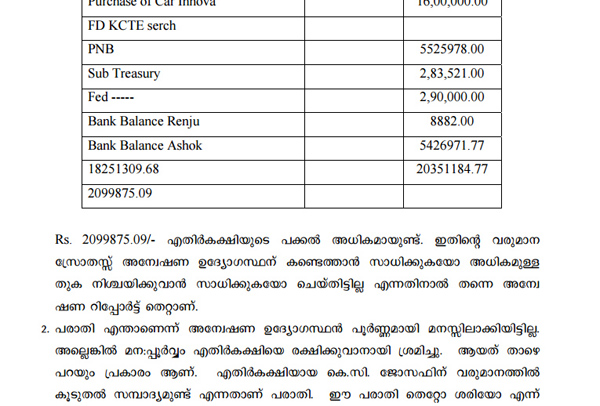 എന്നാൽ ഇക്കഴിഞ്ഞ തിരഞ്ഞെടുപ്പുമായി ബന്ധപ്പെട്ട് ഏപ്രിൽ 28ന് നൽകിയ സത്യവാങ്മൂലത്തിൽ 1,32,69,578 രൂപയാണ് സ്വത്തായി കാണിച്ചിട്ടുള്ളത്. മന്ത്രിയായിരിക്കെ ജോസഫ് സമ്പാദിച്ച പണത്തിനും ബാങ്ക് ഉദ്യോഗസ്ഥയായിരുന്നു ഇദ്ദേഹത്തിന്റെ പത്നിക്കു ലഭിച്ച സമ്പാദ്യത്തിനും കണക്കുണ്ടെന്നിരിക്കെ ഇതിൽ കവിഞ്ഞ സ്വത്ത് ഈ അഞ്ചുവർഷക്കാലത്ത് ജോസഫിന് ലഭിച്ചുവെന്നായിരുന്നു പരാതി.
