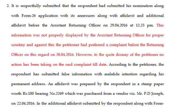 തെരഞ്ഞെടുപ്പിൽ മത്സരിക്കുന്നതിന് നൽകിയ വിലാസമായി ജോസഫ് കാണിച്ചിരിക്കുന്നത് ശ്രീകണ്ഠാപുരത്ത് കോൺഗ്രസ് ഓഫീസിന്റെ വിലാസമാണ്. കോട്ടയത്ത് സ്ഥിരതാമസക്കാരനായ ജോസഫ് ശ്രീകണ്ഠാപുരം മുനിസിപ്പാലിറ്റി കെട്ടിടനമ്പർ പോലും നൽകാത്ത, നിർമ്മാണം പൂർത്തിയാകാത്ത ഒരു കെട്ടിടം സ്ഥിരംമേൽവിലാസമായി നൽകിയത് വോട്ടർമാരെ തെറ്റിദ്ധരിപ്പിക്കുന്നതാണെന്ന വാദമാണ് ഹർജിയിൽ ഉന്നയിക്കുന്നത്.