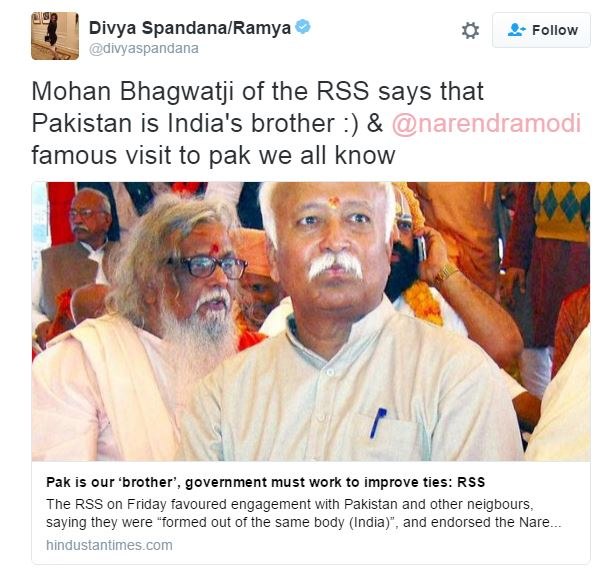 ഇതിനെയാണു പ്രധാനമന്ത്രി നരേന്ദ്ര മോദിയുടേയും ആർഎസ്എസ് തലവൻ മോഹൻ ഭാഗവതിന്റേയും മുൻകാല പാക് 'സ്നേഹം' ചൂണ്ടിക്കാട്ടി ട്വിറ്ററിൽ രമ്യ പ്രതികരിച്ചത്. 'പാക്കിസ്ഥാൻ ഇന്ത്യയുടെ സഹോദരനാണെന്ന് ആർഎസ്എസ് നേതാവ് മോഹൻ ഭാഗവത് ജീ പറയുന്നു. നരേന്ദ്ര മോദിയുടെ പ്രശസ്തമായ പാക് സന്ദർശനം നമുക്കെല്ലാവർക്കും അറിയാവുന്ന കാര്യമാണല്ലോ' രമ്യ കുറിച്ചു.