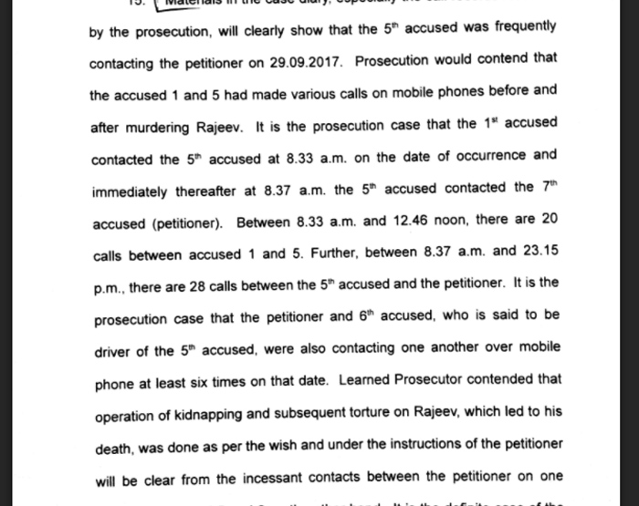 രാജീവ് കൊല്ലപ്പെട്ടതിന് മുമ്പും പിമ്പും ഒന്നാം പ്രതിയും അഞ്ചാം പ്രതിയും തമ്മിൽ നിരവധി തവണ ഫോണിൽ ബന്ധപ്പെട്ടു. രാജീവ് കൊല്ലപ്പെട്ട ദിവസം രാവിലെ 8.33ന് ആണ് ഒന്നാം പ്രതി അഞ്ചാം പ്രതിയെ വിളിക്കുന്നത്. ഇതിന് തൊട്ടു പിന്നാലെ 8.37ന് അഞ്ചാം പ്രതി കേസിൽ ഏഴാം പ്രതിയായ ഉദയഭാനുവുമായി ഫോണിൽ ബന്ധപ്പെട്ടു. രാവിലെ 8.33നും ഉച്ചയ്ക്ക് 12.46നും ഇടയിൽ ഒന്നും അഞ്ചും പ്രതികൾ തമ്മിൽ 20 തവണ ഫോൺ വിളികൾ ഉണ്ടായി. 8.37നും രാത്രി 11.15നും ഇടയ്ക്ക് അഞ്ചാംപ്രതിയും ഉദയഭാനുവും തമ്മിൽ 28 തവണയാണ് ഫോണിൽ ബന്ധപ്പെട്ടത്. അഞ്ചാം പ്രതിയുടെ ഡ്രൈവറായ ആറാം പ്രതിയുമായും ഫോൺ സംഭാഷണം ഉണ്ടായിട്ടുണ്ട്. ഈ തെളിവുകൾ ചൂണ്ടിക്കാട്ടിയാണ് രാജീവിനെ തട്ടിക്കൊണ്ടുപോതും തുടർന്നു നടന്ന പീഡനവും എല്ലാം ഉദയഭാനുവിന്റെ അറിവോടെയാണ് നടന്നതെന്ന് പ്രൊസിക്യൂഷൻ വാദിച്ചത്.