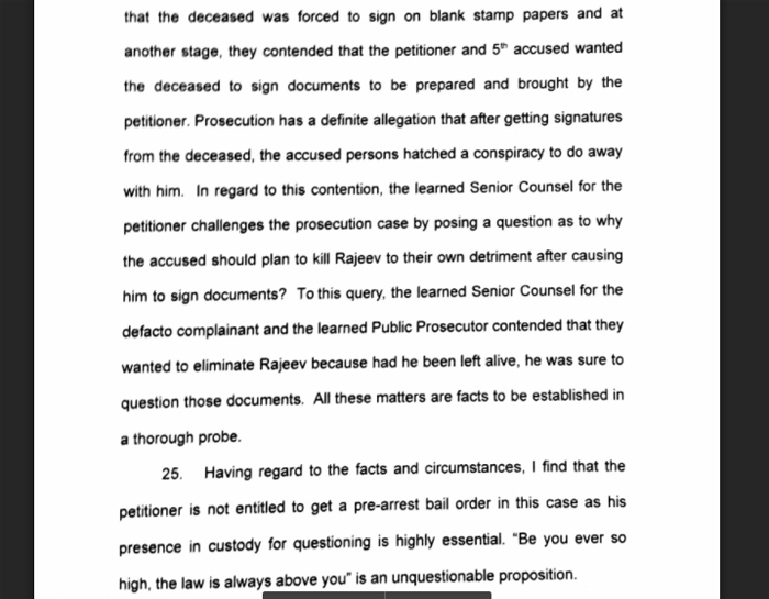 ഇത്തരത്തിൽ വിശദമായ വിധി ഒരു ജാമ്യാപേക്ഷയിൽ ഉണ്ടാകുന്നതും അപൂർവമാണ്. സെപ്റ്റംബർ 29ന് രാവിലെ ഏഴുമണിക്ക് ശേഷം കൊല്ലപ്പെട്ട രാജീവിന് ഒന്നുമുതൽ നാലുവരെ പ്രതികൾ തട്ടിക്കൊണ്ടുപോയതുമുതൽ ഉള്ള സംഭവങ്ങളെല്ലാം പരാമർശിച്ചുകൊണ്ടാണ് ഉത്തരവ്. ഉദയഭാനുവോ അഞ്ച്, ആറ് പ്രതികളോ രാജീവിനെ കൈകാര്യം ചെയ്തുവെന്ന് പറയുന്ന സ്ഥലത്ത് ഉണ്ടായില്ലെന്ന വാദമാണ് ഉദയഭാനുവിന്റെ അഭിഭാഷകർ ഉയർത്തിയത്.