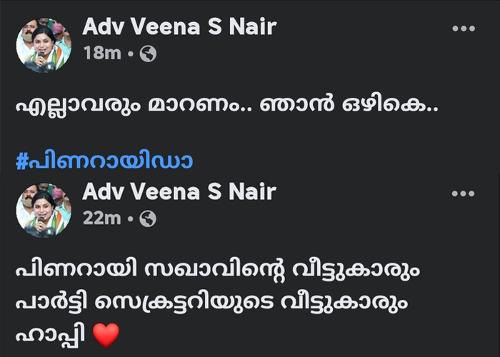 'എല്ലാവരും മാറണം ഞാൻ ഒഴികെ; പിണറായി സഖാവിന്റെ വീട്ടുകാരും പാർട്ടി സെക്രട്ടറിയുടെ വീട്ടുകാരും ഹാപ്പി'; സിപിഎം മന്ത്രിമാരുടെ പട്ടികയെ പരിഹസിച്ച് കോൺഗ്രസ് നേതാവ് അഡ്വ. വീണ എസ് നായർ