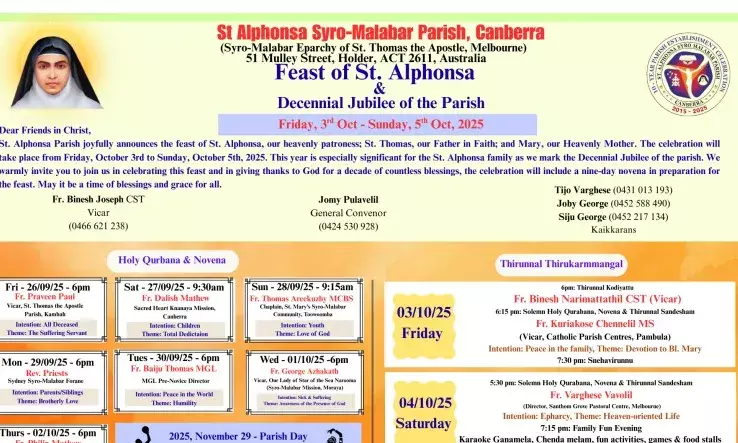 കാന്ബറ: ഓസ്ട്രേലിയന് തലസ്ഥാന നഗരമായ കാന്ബറയിലെ സെന്റ്. അല്ഫോന്സാ സീറോ മലബാര് ഇടവകയില് ഇടവക മധ്യസ്ഥയായ വിശുദ്ധ അല്ഫോന്സാമ്മയുടെയും, പരിശുദ്ധ കന്യാ മാറിയത്തിത്തിന്റെയും, സെന്റ്. തോമസിന്റേയും തിരുന്നാള് ഒക്ടോബര് 3, 4 ,5 (വെള്ളി, ശനി, ഞായര്) തീയതികളില് ആഘോഷിക്കും. ഇതോടൊപ്പം ഇടവക പ്രഖ്യാപനത്തിന്റെ പത്താം വാര്ഷികാഘോഷവും വാര്ഷികവും ആഘോഷിക്കും.