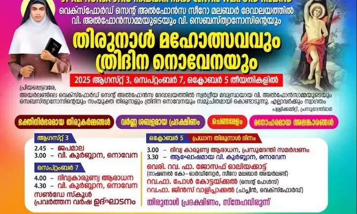 വെക്സ്ഫോര്ഡ് (അയര്ലണ്ട്). വെക്സ്ഫോര്ഡ് സെന്റ് അല്ഫോന്സാ സീറോ മലബാര് കമ്യൂണിറ്റിയില് ഇടവക മധ്യസ്ഥയായ വി. അല്ഫോന്സാമ്മയുടേയും, പരിശുദ്ധ ദൈവമാതാവിന്റേയും വി. സെബസ്ത്യാനോസിന്റേയും സംയുക്ത തിരുനാള് 2025 ഒക്ടോബര് 5 ഞായറാഴ്ച് വിപുലമായ രീതിയില് ആഘോഷിക്കുന്നു.