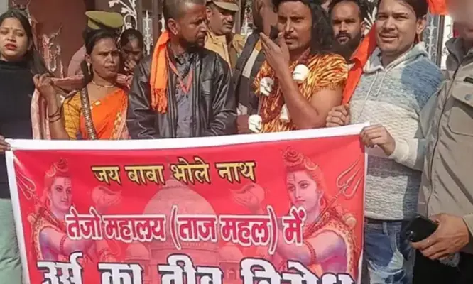 ഉറുസ് നിരോധിക്കണം; താജ്മഹലിന് മുന്നിൽ പ്രതിഷേധവുമായി ഹിന്ദു മഹാസഭ; ഉറുസ് നടത്തിയാൽ ശിവതാണ്ഡവം സംഘടിപ്പിക്കുമെന്ന് ഭീഷണി