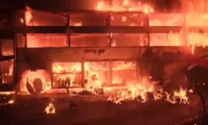 നെല്ലൂരില് നിന്ന് ഹൈദരാബാദിലേക്ക് പോകുകയായിരുന്ന ബസാണ് അപകടത്തില്പ്പെട്ടത്. അപകടസമയം ബസില് 36 യാത്രക്കാരാണുണ്ടായിരുന്നത്. ബസിന്റെ ടയര് പൊട്ടിത്തെറിച്ചാണ് അപകടമുണ്ടായത്. തുടര്ന്ന് ബസിനു നിയന്ത്രണം നഷ്ടമാവുകയും ഡിവൈഡര് മറികടന്ന് എതിര്ദിശയില് സഞ്ചരിച്ച ട്രക്കില് ഇടിക്കുകയുമായിരുന്നു. അപകടത്തില് ട്രക്കിലെ ഡ്രൈവറും ക്ലീനറും ബസ് ഡ്രൈവറുമാണ് മരിച്ചത്. ഇവരുടെ മൃതദേഹം തിരിച്ചറിയാന് കഴിയാത്ത വിധം കത്തിക്കരിഞ്ഞതായി പൊലീസ് പറഞ്ഞു.