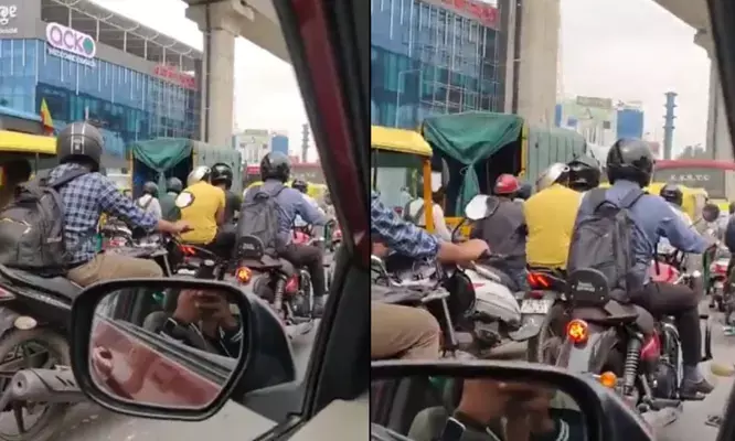 ബെംഗളൂരു: ബെംഗളൂരു നഗരത്തിൽ ഹെൽമെറ്റിന് പകരം തലയിൽ പാത്രം വെച്ച് ബൈക്കിൽ യാത്ര ചെയ്ത യുവാവിൻ്റെ വീഡിയോ സമൂഹമാധ്യമങ്ങളിൽ വ്യാപകമായി പ്രചരിച്ചതോടെ നടപടി സ്വീകരിച്ച് പോലീസ്. റൂപ്പേന അഗ്രഹാരക്ക് സമീപം ഗതാഗതക്കുരുക്കിനിടയിലൂടെ ബൈക്ക് പോകുന്നത് ദൃശ്യങ്ങളിൽ കാണാം. ബൈക്ക് ഓടിച്ചയാൾ ഹെൽമെറ്റ് ധരിച്ചിരുന്നെങ്കിലും, പിന്നിലിരുന്നയാൾ തലയിൽ ചീനച്ചട്ടി (കടായി) വെച്ചാണ് യാത്ര ചെയ്തത്. ഈ കാഴ്ച രസകരമായി തോന്നാമെങ്കിലും, റോഡ് സുരക്ഷയെക്കുറിച്ചുള്ള ഗൗരവമേറിയ ചർച്ചകൾക്ക് ഇത് വഴിവെച്ചിട്ടുണ്ട്.