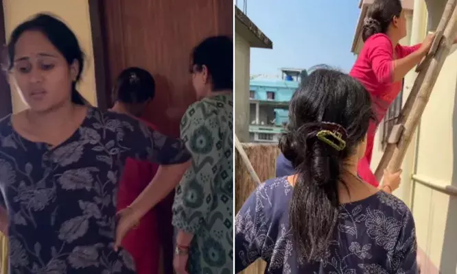 ബാത്ത്റൂമിനുള്ളിൽ കുടുങ്ങിപ്പോയ മകൻ; ഞൊടിയിടയിൽ വണ്ടർ വുമണിനെ പോലെ അമ്മയുടെ വരവ്; വാതിൽ തള്ളി നോക്കിയും; ഓടി മതിലിൽ കയറിയും പെടാപ്പാട്; റീലിന് വ്യാപക വിമർശനം