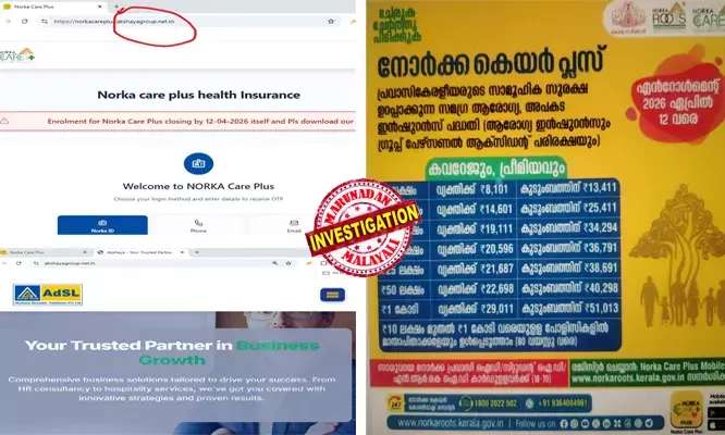 സാധുവായ നോര്ക്ക പ്രവാസി ഐഡി/സ്റ്റുഡന്റ് ഐഡി/എന്ആര്ഐ ഐഡി കാര്ഡുള്ള 18 നും 70 നുമിടയില് പ്രായമുള്ളവര്ക്കാണ് പദ്ധതിയില് ചേരാന് സാധിക്കുക. ആദ്യം 450 രൂപ മുടക്കി നോര്ക്ക ഐഡി കാര്ഡ് എടുക്കണം. അതിന് ശേഷം ഇന്ഷുറന്സ് പോളിസി എടുക്കാന് ശ്രമിക്കുമ്പോള് നോര്ക്ക സൈറ്റില് നിന്ന് norkacareplus.akshayagroup.net.in എന്ന സൈറ്റിലേക്കാണ് റീഡയറക്ട് ചെയ്യുന്നത്. ഈ സൈറ്റ് എഡിഎസ്എല് എന്ന ഒരു കമ്പനിയുടേത് എന്നാണ് കാണിക്കുന്നത്. അതായത് akshayagroup.net.in എന്ന കമ്പനി അവരുടെ അതില് പറയുന്നത് അക്ഷയ ഡൈനാമിക് സൊലൂഷന് പ്രൈവറ്റ് ലിമിറ്റഡ് എന്നാണ്. പക്ഷേ, ഈ പേരില് പോളിസി ബ്രോക്കേജ് സ്ഥാപനം നിലവിലില്ല. ഇനി ഇവരുടെ പേജില് കയറി നോക്കിയാല് കാണാന് കഴിയുന്നത് ബംഗളൂരു അഡ്രസാണ്. ഈ അഡ്രസ് നിലവിലില്ലാത്തതാണ്. About us പേജിലാകട്ടെ ഒരു യുഎസ് അഡ്രസും യുകെ ഫോണ് നമ്പരുമാണ്. ഇതില് നല്കിയിരിക്കുന്ന ഇമെയില് ഐഡിയും പ്രവര്ത്തിക്കാത്തതാണ്.