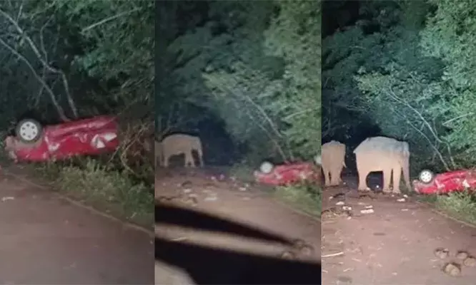 തകരാറിലായതിനെ തുടർന്ന് വാഹനം റോഡരികിൽ നിർത്തിയിട്ടു; കാർ തകർത്ത് കാട്ടാനക്കൂട്ടം; സംഭവം അതിരപ്പിള്ളിയിൽ