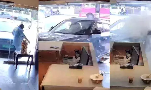 കാര് തിരിയുന്നതിനിടെയാണ് ഗ്യാസ് ഏജന്സി ജീവനക്കാരൻ പുറത്തേക്ക് ഇറങ്ങുന്നത്. ജീവനക്കാരനെ തട്ടിയിട്ടശേഷമാണ് കാര് ഹോട്ടലിന് അകത്തേക്ക് ഇടിച്ചുകയറിയത്. ഇതിന് പിന്നാലെ സ്ഥലത്ത് വലിയ രീതിയിൽ പുക ഉയര്ന്നത് പരിഭ്രാന്തി പരത്തി. സ്ഥലത്ത് പോലീസെത്തി മേൽനടപടികൾ സ്വീകരിച്ചു.