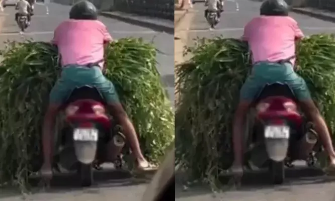 പുറത്തുവിട്ട ദൃശ്യങ്ങളിൽ, ഒരാൾ സ്കൂട്ടറിൽ തലയിൽ ഹെൽമറ്റ് ധരിച്ച് യാത്ര ചെയ്യുന്നത് കാണാം. എന്നാൽ, സാധാരണ പിന്നിലെ യാത്രക്കാരൻ ഇരിക്കേണ്ട സീറ്റിലാണ് ഇദ്ദേഹം ഇരിക്കുന്നത്. സ്കൂട്ടറിന്റെ ഫ്ലോർബോർഡ് മുതൽ മുന്നിലെ സീറ്റിന് മുകളിൽ വരെ വലിയ ഉയരത്തിൽ പുല്ല് കെട്ടി വെച്ചിരിക്കുന്ന അവസ്ഥയിലായിരുന്നു യാത്ര. ഈ പുൽക്കെട്ടിന് മുകളിലൂടെ വളരെ ബുദ്ധിമുട്ടിയാണ് ഇദ്ദേഹം സ്കൂട്ടറിന്റെ ഹാൻഡിലിൽ പിടിച്ച് ഓടിച്ചിരുന്നത്.