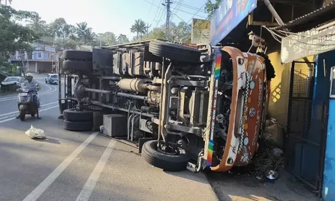 ഫുൾ ലോഡുമായി എത്തിയ ലോറി; വളവിൽ ഇരച്ചെത്തിയതും നിയന്ത്രണം നഷ്ടപ്പെട്ട് അപകടം; ഡ്രൈവർക്കും കിളിക്കും പരിക്ക്; സംഭവം പാറശ്ശാലയിൽ