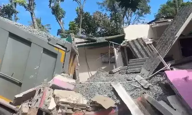 കുത്തുകയറ്റം കയറവെ ഭാരത് ബെൻസിന്റെ നിയന്ത്രണം ആകെ നഷ്ടപ്പെട്ടു; വീടിന് മുകളിലേക്ക് ടോറസ് ലോറി മറിഞ്ഞ് വീണ് അപകടം; കുടുംബം രക്ഷപ്പെട്ടത് ഭാഗ്യം കൊണ്ട് മാത്രം; സംഭവം നെടുങ്കണ്ടത്ത്