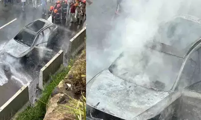 കോഴിക്കോട് ഹൈലൈറ്റ് മാളിന് സമീപം ഓടിക്കൊണ്ടിരുന്ന ഇലക്ട്രിക് കാറിന് തീപിടിച്ചു; കാറിലുണ്ടായിരുന്നത് നാലംഗ കുടുംബം തലനാരിഴയ്ക്ക് രക്ഷപ്പെട്ടു