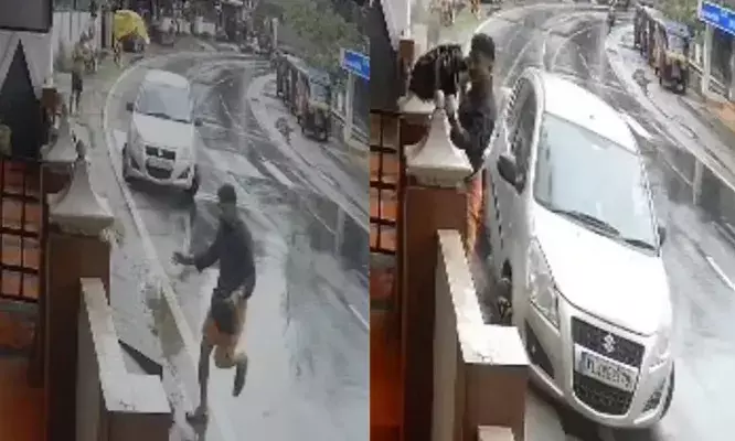 തൃശ്ശൂര്: സംസ്ഥാനപാതയില് നിയന്ത്രണം വിട്ട കാര് നടപ്പാതയിലേക്ക് ഇടിച്ചുകയറി അപകടം. റോഡ് മുറിച്ചു കടക്കുകയായിരുന്ന കാല്നട യാത്രക്കാരന് തലനാരിഴയ്ക്ക് രക്ഷപെട്ടു. വേഗത്തില് വന്ന കാറിനു മുന്നിലൂടെ കാല്നടയാത്രക്കാരനായ യുവാവ് റോഡിന്റെ മറുവശത്തേയ്ക്ക് ഓടിയതാണ് അപകടത്തിനിടയാക്കിയത്. തലനാരിഴയ്ക്കാണ് വാഹനം ഇയാളെ ഇടിക്കാതിരുന്നത്.വാഴക്കോട്-പ്ലാഴി സംസ്ഥാന പാതയില് ചൊവ്വാഴ്ച ഉച്ചയ്ക്ക് 12.14-നായിരുന്നു സംഭവം.