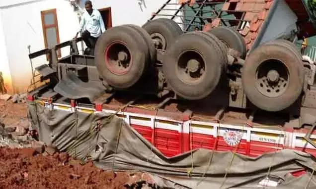 ഫറോഖ് നഗരസഭ ചെയര്മാന് എം സി അബ്ദുള് റസാഖിന്റെ വീടിന് മുകളിലേക്ക് മറിഞ്ഞത് സിമന്റ് ലോറി; റോഡ് ഇടിഞ്ഞ് അപകടം