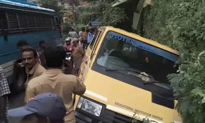 സ്വകാര്യ ബസ്സിന്റെ പിന്ഭാഗം സ്കൂള് ബസ്സില് തട്ടി; ബസ് ഓടയിലേക്ക് മറിഞ്ഞ് വിദ്യാര്ത്ഥിക്ക് പരിക്ക്
