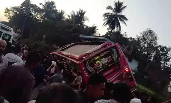 സ്കൂട്ടറിനെ വെട്ടിക്കുന്ന ബസ് നിയന്ത്രണം വിട്ട് പറമ്പിലേക്ക് പാഞ്ഞുകയറി; കാറിന് മുകളില് ചെരിഞ്ഞു വീണു; യാത്രക്കാര്ക്ക് പരിക്ക്