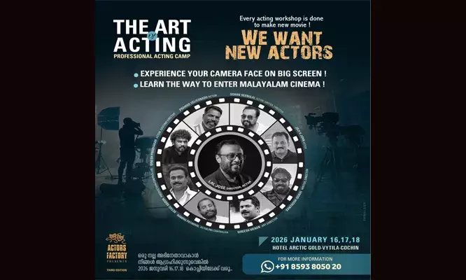 കൊച്ചി : ആക്ടേഴ്സ് ഫാക്ടറി യുടെ മൂന്നാമത് ആക്ടിംഗ് വര്ക്ക്ഷോപ്പ് ജനുവരി 16 17 18 കൊച്ചിയില് HOTEL ARCTIC GOLD, വൈറ്റില യില് വെച്ച് നടക്കുന്നു. സൂപ്പര്ഹിറ്റ് സംവിധായകന് ലാല് ജോസ് അടക്കം ഒട്ടേറെ സിനിമ പ്രവര്ത്തകരാണ് ഈ അഭിനയ പരിശീലന കളരിക്ക് നേതൃത്വം നല്കുന്നത്.