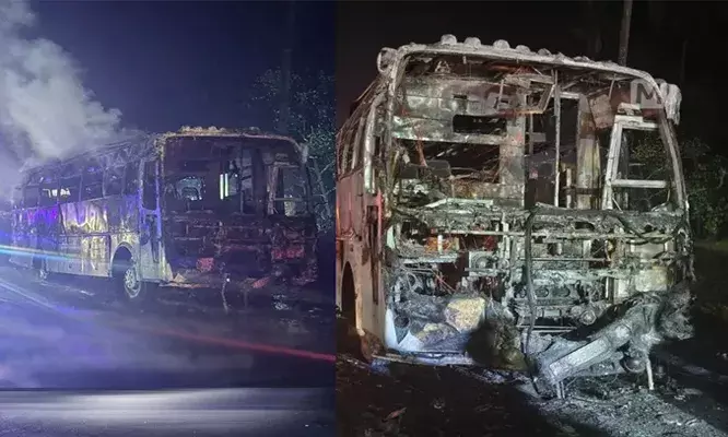 ബസിനുള്ളില് മുന്ഭാഗത്തുനിന്ന് പുക ഉയരുന്നത് ശ്രദ്ധയില്പ്പെട്ട യാത്രക്കാര് ബഹളം വെച്ചതാണ് രക്ഷയായത്. ഉടന് തന്നെ ഡ്രൈവര് വാഹനം റോഡരികില് നിര്ത്തി. ബസിലുണ്ടായിരുന്ന യാത്രക്കാരെല്ലാം വേഗത്തില് പുറത്തിറങ്ങിയതിനാല് വലിയൊരു ദുരന്തം ഒഴിവാകുകയായിരുന്നു. ഇവര് പുറത്തിറങ്ങി നിമിഷങ്ങള്ക്കകം തന്നെ തീ ബസിനുള്ളിലേക്ക് ആളിപ്പടര്ന്നു. ഞായറാഴ്ച രാത്രി പത്തേകാലോടെയായിരുന്നു സംഭവം.