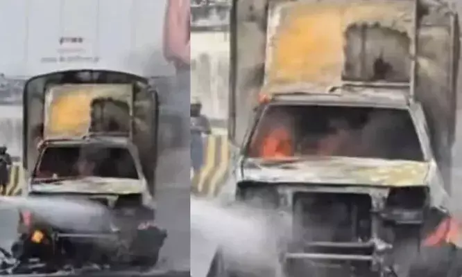 ബൈക്ക് പിക്കപ്പിനടിയിലേക്ക് ഇടിച്ചുകയറി തീപ്പിടിച്ചു; ഇരുവാഹനങ്ങളും കത്തിനശിച്ചു