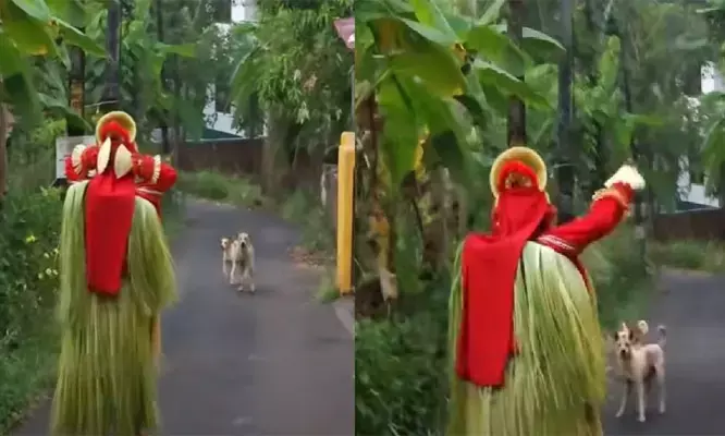 തെയ്യക്കോലത്തിന് നേരെ കുരച്ചുചാടി തെരുവുനായ്ക്കള്; ചിലമ്പൊലിയും അട്ടഹാസവുമായി വിരട്ടിയോടിച്ച് തെയ്യക്കോലം