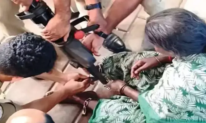 തമിഴ്നാട് നാമക്കല് സ്വദേശിനിയായ 55-കാരിയെ ആണ് ഭര്ത്താവ് ചങ്ങലയ്ക്കിട്ടത്. ശനിയാഴ്ച ഉച്ചയ്ക്ക് ഒന്നരയോടെ കൊല്ലങ്കോട് പട്ടണത്തിനടുത്താണ് കാലുകള് ചങ്ങലയ്ക്കിട്ട നിലയില് സ്ത്രീയെ കണ്ടെത്തുന്നത്. തുടര്ന്ന് നാട്ടുകാര് കൊല്ലങ്കോട് അഗ്നിരക്ഷാസേനാംഗങ്ങള് ഏറെനേരം ശ്രമിച്ച് ചങ്ങലയും പൂട്ടുകളും കട്ടര് ഉപയോഗിച്ച് മുറിച്ചുമാറ്റി സ്ത്രീയെ മോചിപ്പിച്ചു. തുടര്ന്ന്, ഇവരെ കൊല്ലങ്കോട് പോലീസിന് കൈമാറി.