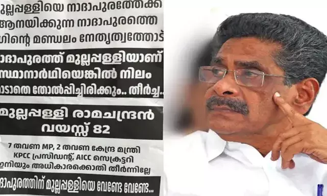 മുല്ലപ്പള്ളിയെ മണ്ഡലത്തിലേക്ക് ആനയിക്കുന്ന മുസ്ലിം ലീഗ് നേതൃത്വത്തിന് മുന്നറിയിപ്പ് നല്കുന്ന പോസ്റ്ററുകള്, അദ്ദേഹം സ്ഥാനാര്ത്ഥിയായാല് നിലംതൊടാതെ തോല്പ്പിക്കുമെന്നും ഭീഷണി മുഴക്കുന്നു. വടകര പാര്ലമെന്റ് മണ്ഡലത്തെ ദീര്ഘകാലം പ്രതിനിധീകരിച്ച മുല്ലപ്പള്ളിക്ക് നാദാപുരത്ത് വ്യക്തിപരമായ സ്വാധീനമുണ്ടെന്നും അദ്ദേഹത്തിന്റെ സാന്നിധ്യം ജില്ലയില് ഗുണം ചെയ്യുമെന്നും ഒരു വിഭാഗം വിലയിരുത്തുമ്പോഴാണ് ഈ പ്രതിഷേധം. യുവാക്കള്ക്ക് അവസരം നല്കണമെന്ന വാദവും മുതിര്ന്ന നേതാക്കള് മാറണമെന്ന വികാരവുമാണ് ഈ പോസ്റ്റര് പ്രചാരണത്തിന് പിന്നിലെന്നാണ് കരുതുന്നത്.