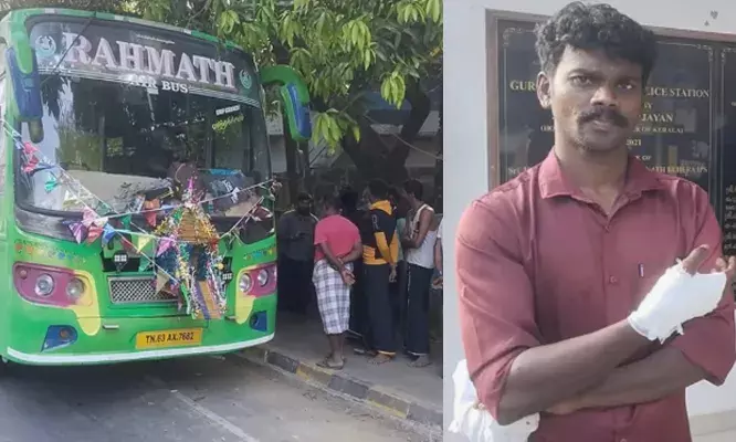 രാവിലെ ഏഴുമണിയോടെ മേൽപ്പാലമിറങ്ങിയ ബസ് ഇടത്തോട്ട് തിരിയുന്നതിനു പകരം വലത്തോട്ട് തിരിയുകയായിരുന്നു. ഹരീഷ് നിർദ്ദേശം നൽകിയിട്ടും ബസ് മുന്നോട്ട് പോയതോടെ, അദ്ദേഹം ബസിന് പിന്നാലെ എത്തി കൈകൊണ്ട് ബസിൽ അടിച്ചു. ഈ സമയം ബസിന്റെ ഇടതുഭാഗത്തുള്ള ക്വാർട്ടർ ഗ്ലാസ് പൊട്ടി ഹരീഷിന്റെ കൈക്ക് പരിക്കേറ്റു. ഇതിന് പിന്നാലെ ബസിൽ നിന്നിറങ്ങിയ തമിഴ്നാട് സ്വദേശികളും ബസ് ജീവനക്കാരും ചേർന്ന് ഹരീഷിനെ മർദ്ദിക്കുകയായിരുന്നു. പരിക്കേറ്റ ഹരീഷിനെ ദേവസ്വം മെഡിക്കൽ സെന്ററിൽ പ്രവേശിപ്പിച്ചു.