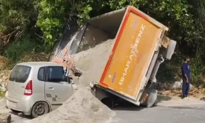 ഭാരത് ബെൻസിന്റെ കൂറ്റൻ ടിപ്പർ ഒരു വശം പൂർണമായും മറിഞ്ഞ് കാറിന് മുകളിൽ കിടക്കുന്ന അതിഭീകര കാഴ്ച; വണ്ടിയുടെ ടയർ പൊട്ടിയുള്ള അപകടത്തിൽ നിന്ന് കുടുംബം രക്ഷപ്പെട്ടത് ഭാഗ്യം കൊണ്ട് മാത്രം