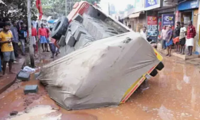 'ഇത് ന്യൂയോർക്കിലെക്കാൾ കേമം തന്നെ..'; ഹോളോ ബ്രിക്സ് കയറ്റിവന്ന ആ സ്വരാജ് മസ്ദ; ലോഡുമായി പതിയെ വെള്ളം നിറഞ്ഞ കുഴിലിറങ്ങിയതും ദേ..കിടക്കണ്; റോഡിൽ ടിപ്പർ ലോറി മറിഞ്ഞ് അപകടം