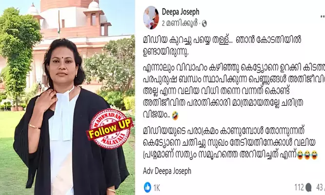 'സ്ത്രീയായതുകൊണ്ട് മാത്രം രക്ഷപ്പെട്ടെന്ന് സുപ്രീംകോടതി; പിന്നാലെ മാധ്യമങ്ങളെ പരിഹസിച്ച് അഡ്വ. ദീപ ജോസഫ്! 'മീഡിയ പയ്യെ തള്ള്... കെട്ട്യോനെ ഉറക്കി കിടത്തി സുഖം തേടുന്നവര് അതിജീവിതയല്ല എന്ന വലിയ വിധി വന്നില്ലേ? അതിജീവിത പരാതിക്കാരി മാത്രമായതല്ലേ ചരിത്ര വിജയം? തിരിച്ചടി നേരിട്ടിട്ടും വാദത്തില് ഉറച്ച് അഭിഭാഷക