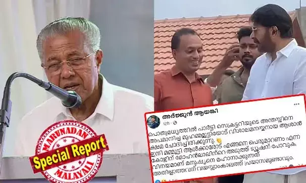 'പൊതുമധ്യത്തില് പാര്ട്ടി സെക്രട്ടറിയുടെ അന്തസ്സിനെ അപമാനിച്ച മുഹമ്മദ്കുട്ടിയോട് വിശാലമനസ്കനായ ആശാന് ക്ഷമ ചോദിച്ചിരിക്കുന്നു! ഇനി മമ്മൂട്ടി ആള്ക്കാരോട് എങ്ങനെ പെരുമാറണം എന്ന കോഴ്സിന് മോഹന്ലാലിന്റെ അടുത്ത് ട്യൂഷന് പോവുക'; ടൗണ്ഷിപ്പ് സന്ദര്ശന വിവാദത്തില് മമ്മൂട്ടിയോട് മാപ്പു പറഞ്ഞ മുഖ്യമന്ത്രിക്കും സൈബറിടത്തില് വിമര്ശനം