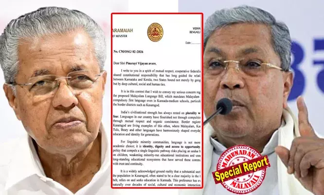 പിണറായിയുടെ ബുള്ഡോസര് നീതി പ്രയോഗത്തില് കലി കയറിയ സിദ്ധരാമയ്യ മലയാള ഭാഷാ ബില്ലില് പിടിച്ച് പ്രത്യാക്രമണം; മലയാളം അടിച്ചേല്പ്പിക്കുന്നുവെന്ന് കത്തും പരാതിയും; ഭാഷാ ന്യൂനപക്ഷങ്ങള്ക്ക് ആശങ്ക വേണ്ടെന്ന് വസ്തുതകള് നിരത്തി പിണറായിയുടെ മറുപടി; അതിര്ത്തി കടന്ന് രാഷ്ട്രീയ പോര്
