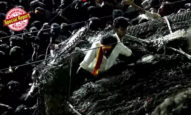 പാര്ട്ടി പതാക പതിച്ച വെളള ടീ ഷര്ട്ടുകള് ധരിച്ച കൗമാരക്കാര് വെപ്രാളത്തോടെ ഓല ഷെഡ്ഡുകള് പൊളിച്ച് മേല്ക്കൂരയില് കയറി രക്ഷപ്പെടുന്ന ദൃശ്യങ്ങളാണ് ഇന്ത്യ ടുഡേ പുറത്തുവിട്ടത്. തിക്കി തിരക്കുന്ന ആള്ക്കൂട്ടത്തില് നിന്ന് മറ്റുപലരും ഇവരെ പിന്തുടര്ന്ന് രക്ഷപ്പെടുന്നതും കാണാം. കഠിനമായ വെയിലില് തളര്ന്നവര്, കുടിവെള്ളവും മറ്റ് അടിസ്ഥാന സൗകര്യങ്ങളും ഇല്ലാതെ വന്നതോടെ കുഴഞ്ഞുവീഴുകയായിരുന്നു.