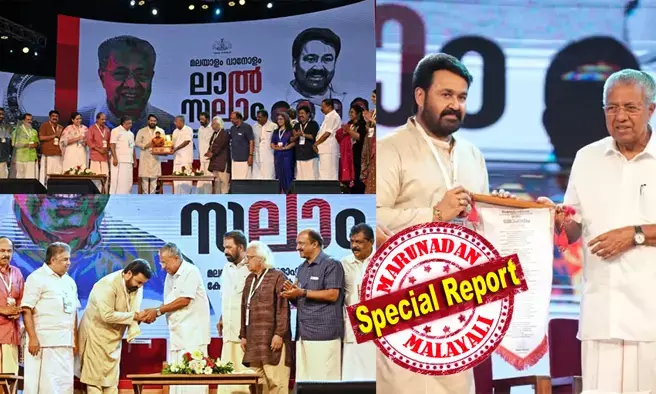 മോഹന്ലാലിനെ ആദരിച്ച 'മലയാളം വാനോളം, ലാല്സലാം' വേദിയില് ക്ഷണിക്കാതെ എത്തി എം.വി ഗോവിന്ദന്; പങ്കെടുക്കാതെ പ്രതിപക്ഷ നേതാവും സ്ഥലം എം പി ശശി തരൂരും; ആദരിക്കല് വേദിയില് ലാലിനേക്കാള് വലിപ്പത്തില് മുഖ്യമന്ത്രിയുടെ ചിരിക്കുന്ന ചിത്രവും; ലാലേട്ടനെ ആദരിക്കുന്ന ചടങ്ങ് രാഷ്ട്രീയ ലക്ഷ്യത്തോടെയെന്ന് പ്രതിപക്ഷ വിമര്ശനം