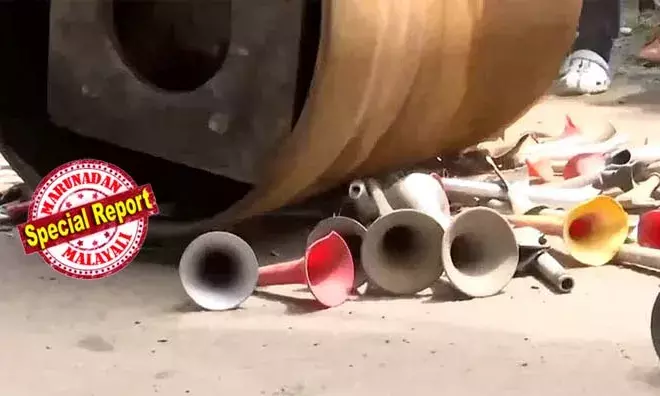 വാഹനങ്ങളില്നിന്ന് പിടിച്ചെടുക്കുന്ന എയര്ഹോണുകള് പൊതുസ്ഥലത്തുവെച്ച് റോഡ്റോളര് കയറ്റി നശിപ്പിക്കാന് ഉദ്യോഗസ്ഥര്ക്ക് കഴിഞ്ഞദിവസം നിര്ദേശം ലഭിച്ചിരുന്നു. ഇതേ തുടര്ന്നാണ് പടികൂടിയ എയര്ഹോണുകള് റോഡ് റോളര് കയറ്റി ഉദ്യോഗസ്ഥര് തകര്ത്തത്. എയര്ഹോണുകള് വീണ്ടും ഉപയോഗിക്കാതിരിക്കാന്വേണ്ടിയാണ് പിടിച്ചെടുക്കുന്നത്. സാധാരണ ഇവ ഓഫീസുകളില് സൂക്ഷിക്കാറുണ്ട്. നശിപ്പിക്കാനുള്ള നീക്കത്തിനെതിരേ ആരെങ്കിലും കോടതിയെ സമീപിച്ചാല് തിരിച്ചടിയാകുമെന്ന ഭയം ഉദ്യോഗസ്ഥര്ക്കുണ്ട്.