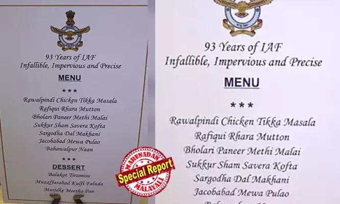റാവല്പിണ്ടി ചിക്കന് ടിക്ക മുതല് ബഹാവല്പൂര് നാനും ബാലാകോട്ട് തിരമിസുവും വരെ: ഓപ്പറേഷന് സിന്ദൂറില് ഇന്ത്യ തിരിച്ചടിച്ച സ്ഥലപ്പേരുകള് ചേര്ത്ത് വ്യോമസേനയുടെ അത്താഴവിരുന്നിലെ മെനു; പാക്കിസ്ഥാനെ ട്രോളിയ മെനുവിന്റെ ചിത്രം സാമൂഹ്യ മാധ്യമങ്ങളില് വൈറല്