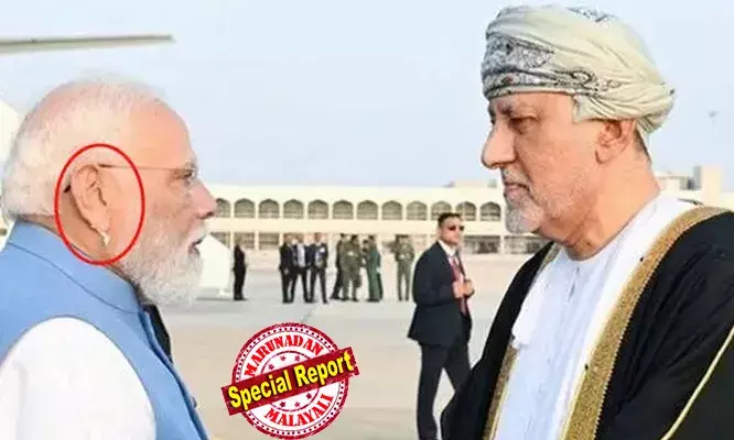 കഴിഞ്ഞദിവസം ഒമാനില് ഔദ്യോഗിക സന്ദര്ശനത്തിനെത്തിയപ്പോഴുള്ള മോദിയുടെ ലുക്കാണ് സോഷ്യല് മീഡിയയില് സജീവ ചര്ച്ചയായത്. ഒമാനിലെത്തിയ പ്രധാനമന്ത്രിക്ക് ഗംഭീര സ്വീകരണമാണ് ലഭിച്ചത്. ഒമാന് ഉപപ്രധാനമന്ത്രി സയ്യിദ് ഷിഹാബ് ബിന് താരിഖ് അല് സെയ്ദാണ് മോദിയെ സ്വീകരിക്കാന് എത്തിയത്. ഗാര്ഡ് ഒഫ് ഓണറും പരമ്പരാഗത നൃത്തവുമായി വന് സ്വീകരണമായിരുന്നു ഒരുക്കിയത്. ഈ സമയത്താണ് മോദിയുടെ ഇടതുചെവിയിലെ 'കമ്മല്' വ്യക്തമായത്.