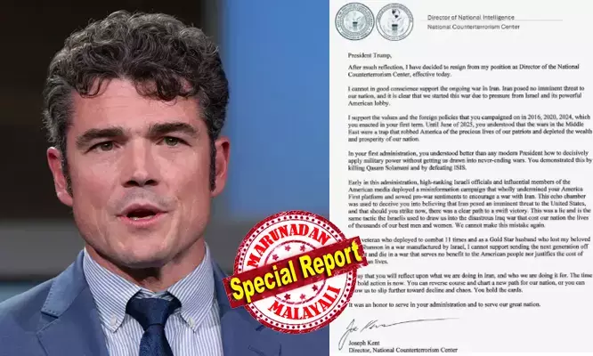 വളരെയേറെ ആലോചിച്ചശേഷമാണ് ഈ തീരുമാനത്തില് എത്തിയതെന്ന് ജോ കെന്റ് പറഞ്ഞു. എന്സിടിസി മേധാവി സ്ഥാനത്തുനിന്ന് ഞാന് രാജിവെക്കുകയാണ്. ഇറാനില് നടക്കുന്ന യുദ്ധത്തെ മനസ്സാക്ഷിക്കുത്തില്ലാതെ എനിക്ക് പിന്തുണയ്ക്കാന് കഴിയുന്നില്ല. അമേരിക്കയെ ദൈവം രക്ഷിക്കട്ടെ, കെന്റ് എക്സില് കുറിച്ചു. അമേരിക്കയുടെ ആഭ്യന്തര സുരക്ഷാ കാര്യങ്ങളില് നിര്ണ്ണായകമായ തീരുമാനങ്ങള് എടുക്കുന്ന ഏജന്സിയുടെ തലവന് തന്നെ ഇത്തരമൊരു നിലപാടുമായി രംഗത്തെത്തിയത് ട്രംപ് ഭരണകൂടത്തെ പ്രതിരോധത്തിലാക്കിയിട്ടുണ്ട്.