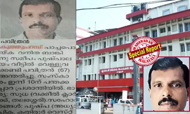 മംഗലാപുരം ഹെഗ്ഡെ ആശുപത്രിയിലായിരുന്നു പവിത്രനെ ആദ്യം പ്രവേശിപ്പിച്ചിരുന്നത്. അവിടെനിന്ന് പവിത്രനുമായി നാട്ടിലേക്ക് വരുന്നതിനിടെയാണ് മരിച്ചെന്ന് കരുതി ബന്ധുക്കള് കണ്ണൂര് എകെജി ആശുപത്രി മോര്ച്ചറിയിലേക്ക് പവിത്രനെ മാറ്റാന് ശ്രമിച്ചത്. ഓക്സിജന് സൗകര്യം മാത്രമുള്ള ആംബുലന്സില് പവിത്രനെ കുടുംബം കണ്ണൂരിലേക്ക് കൊണ്ടുവരികയായിരുന്നു. തുടര്ന്നാണ് വഴിമധ്യേ മരിച്ചെന്ന് കരുതി എകെജി ആശുപത്രി മോര്ച്ചറിയിലേക്കാണ് പവിത്രനെ കൊണ്ടുവന്നത്.