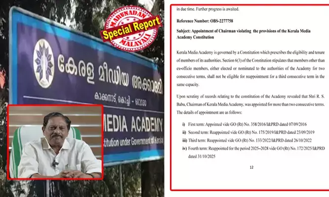 മീഡിയ അക്കാഡമി ഭരണഘടനയിലെ 6(3) വകുപ്പ് പ്രകാരം, ഒരു അംഗത്തിന് തുടര്ച്ചയായി രണ്ട് ടേമിലധികം (Consecutive Terms) ഭാരവാഹിത്വത്തില് തുടരാന് അവകാശമില്ല. എന്നാല് ആര്.എസ്. ബാബുവിന്റെ കാര്യത്തില് ഈ നിയമം പാടേ അവഗണിക്കപ്പെട്ടു.