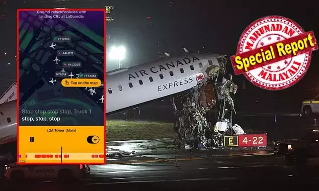 അപകടത്തിനുപിന്നാലെ വിമാനത്തിന്റെ മുന്ചക്രങ്ങള് തകരുകയും മൂക്ക് നിലത്തുരസി നില്ക്കുന്ന നിലയിലുമായിരുന്നു. കൂട്ടിയിടിയുടെ ആഘാതത്തില് പോര്ട്ട് അതോറിറ്റിയുടെ ഫയര് ട്രക്ക് റണ്വേയില് മറിഞ്ഞുകിടക്കുന്ന ചിത്രങ്ങള് പുറത്തുവന്നു. അപകടത്തെത്തുടര്ന്ന് ലാഗ്വാര്ഡിയ വിമാനത്താവളം താത്കാലികമായി അടച്ചു.