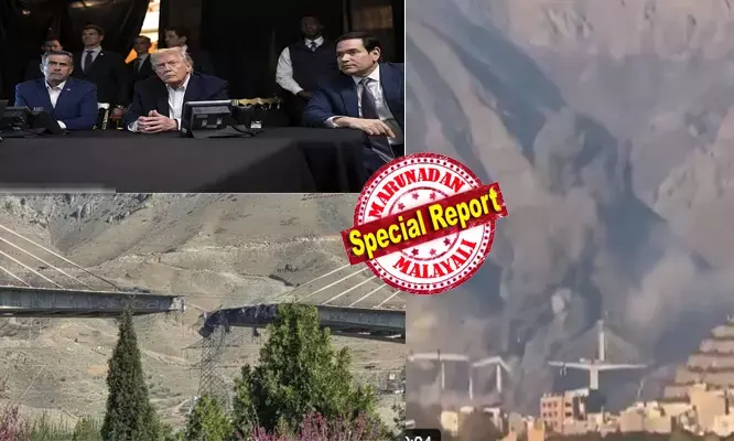 മുംബൈ/ടെഹ്റാന്: ലോകം മുള്മുനയില്! പശ്ചിമേഷ്യയില് ഇസ്രായേല്-ഇറാന് പോര് മുറുകുമ്പോള്, സാക്ഷാല് ഡൊണാള്ഡ് ട്രംപ് നേരിട്ട് കളത്തിലിറങ്ങിയിരിക്കുകയാണ്. 'മര്യാദയ്ക്ക് കരാറില് ഒപ്പിട്ടോ, അല്ലെങ്കില് കാണിച്ചുതരാം' എന്ന ട്രംപിന്റെ അന്ത്യശാസനത്തിന് പിന്നാലെ ഇറാന്റെ അഭിമാന സ്തംഭമായ ബി1 പാലം അമേരിക്കന് മിസൈലുകള് തകര്ത്തെറിഞ്ഞു. തകര്ന്ന പാലത്തിന്റെ വീഡിയോ സോഷ്യല് മീഡിയയില് പങ്കുവെച്ച് ട്രംപ് നടത്തിയ വെല്ലുവിളി ഇപ്പോള് ലോകരാജ്യങ്ങളെ നടുക്കിയിരിക്കുകയാണ്.