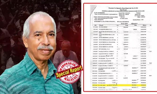 2018 ജൂലൈ മാസം ഒമ്പതാം തീയതി പയ്യന്നൂര് റൂറല് ബാങ്ക് മെയിന് ബ്രാഞ്ചിലുള്ള, ധീര രക്തസാക്ഷി സഖാവ് ധനരാജ് കുടുംബ സഹായനിധിയുടെ അക്കൗണ്ടില് നിന്ന് 5 ലക്ഷം രൂപ അന്നത്തെ ഏരിയ സെക്രട്ടറിയുടെ പേഴ്സണല് അക്കൗണ്ടിലേക്ക് മാറ്റിയതിന്റെ തെളിവ് ഞാന് പൊതുസമക്ഷം വയ്ക്കുകയാണ്.