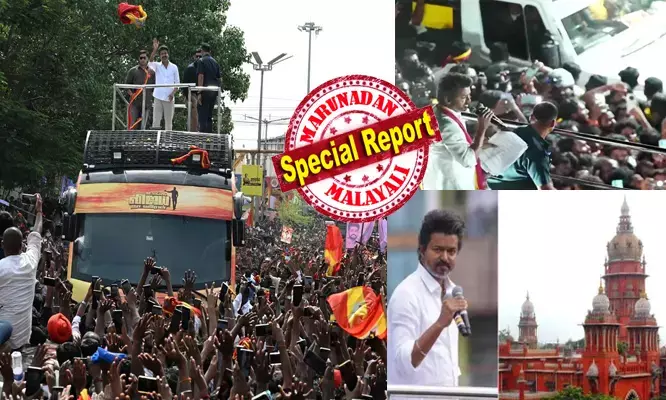 കരൂരിലെ ദുരന്തത്തിൽ നടൻ വിജയ് ഉൾപ്പെടെയുള്ള ടിവികെ നേതാക്കൾക്കെതിരെ മദ്രാസ് ഹൈക്കോടതി രൂക്ഷവിമർശനം ഉന്നയിച്ചിരുന്നു. ദുരന്തമുണ്ടായ ഉടൻ അണികളെ ഉപേക്ഷിച്ച് സ്ഥലംവിട്ട നേതാക്കളുടെ നടപടിയെ കോടതി രൂക്ഷമായി വിമർശിച്ചു. "ദുരന്തമുണ്ടായ ഉടൻ നേതാവ് സംഭവസ്ഥലത്തുനിന്ന് അപ്രത്യക്ഷനാവുകയാണ് ചെയ്തത്. അത് നേതാക്കൾക്കു പറ്റിയ ഗുണമല്ല. ആപത്തിൽപ്പെട്ടവരെ രക്ഷിക്കുന്നത് അവരുടെ ഉത്തരവാദിത്വമാണ്. എത്രയോ കുട്ടികൾക്കും സ്ത്രീകൾക്കുമാണ് ജീവൻ നഷ്ടമായത്. പക്ഷേ, നേതാക്കൾക്ക് ഒട്ടും പശ്ചാത്താപമില്ല," കോടതി നിരീക്ഷിച്ചു. ഐപിഎസ് ഉദ്യോഗസ്ഥന്റെ നേതൃത്വത്തിലുള്ള പ്രത്യേക അന്വേഷണ സംഘം (SIT) സംഭവം വിശദമായി അന്വേഷിക്കണമെന്നും കഴിഞ്ഞ വെള്ളിയാഴ്ച ഹൈക്കോടതി ഉത്തരവിട്ടിരുന്നു.