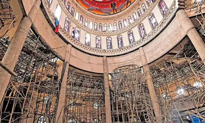 ദേവാലയത്തിന്റെ പുതുതായി ചായം പൂശിയ താഴികക്കുടത്തിനു താഴെയുള്ള ഭാഗത്തെ തട്ടാണ് തകര്ന്നുവീണത്. തട്ട് തകര്ന്നുവീണപ്പോള്, വാതിലില് നിന്നവര്ക്ക് രക്ഷപ്പെടാന് സാധിച്ചെങ്കിലും മധ്യഭാഗത്ത് നിന്നവര് ഇതിനുള്ളില് കുടുങ്ങുകയായിരുന്നു.