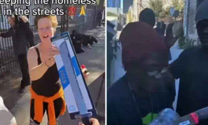 തെരുവിൽ കഴിയുന്നവരുടെ ഇടയിലേക്ക് ഒരാളുടെ വരവ്; ഭക്ഷണമെന്ന് കരുതി ഓടിയെത്തിയ ഹോംലെസ്സ്; അടുത്തെത്തിയതും വാളും വിസ്കി കുപ്പിയും നൽകി ടിക്ടോക്കർ; വ്യാപക വിമർശനം