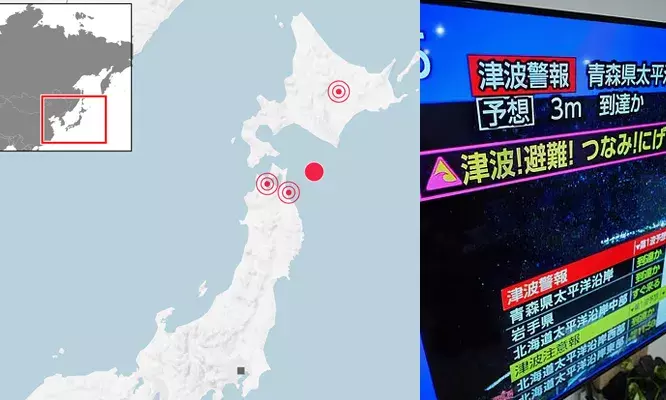 മൂന്ന് മീറ്റര് വരെ ഉയരത്തില് തിരമാലകള് ഉണ്ടാകുമെന്ന് സുനാമി മുന്നറിയിപ്പ് നല്കിയതായും ജനങ്ങളെ പരിഭ്രാന്തിയിലാക്കിയതായും ജപ്പാന് കാലാവസ്ഥാ ഏജന്സി (ജെഎംഎ) അറിയിച്ചു. ജപ്പാന്റെ വടക്ക്, കിഴക്കന് മേഖലകളില് രാത്രി 11:15 ന് ഉണ്ടായ ഭൂകമ്പത്തെ തുടര്ന്ന് ഹൊക്കൈഡോ, അമോറി, ഇവാട്ടെ എന്നീ പ്രവിശ്യകള്ക്ക് സുനാമി മുന്നറിയിപ്പ് നല്കിയതായി വാര്ത്താ ഏജന്സി റോയിട്ടേഴ്സ് റിപ്പോര്ട്ട് ചെയ്തു.